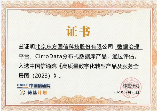 近日,中國信通院“2023 數(shù)字生態(tài)發(fā)展大會”暨中國信通院“鑄基計劃”發(fā)布了《高質(zhì)量數(shù)字化轉(zhuǎn)型產(chǎn)品及服務(wù)全景圖(2023)》。東方國信數(shù)據(jù)治理平臺及CirroData分布式數(shù)據(jù)庫產(chǎn)品成功入選技術(shù)開發(fā)、數(shù)據(jù)分析、數(shù)據(jù)治理3個數(shù)字化圖景并獲得證書。